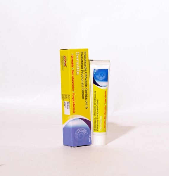 DERMITIN Cream is a broad-spectrum, multi-action dermatological formulation designed to treat stubborn and mixed skin infections involving fungal, bacterial, and inflammatory components. Itraconazole and MPS provide potent antifungal action, Ofloxacin and Ornidazole offer broad antibacterial and antiprotozoal coverage, while Clobetasol Propionate effectively reduces inflammation, redness, and itching. PPS ensures formulation stability and antimicrobial protection.